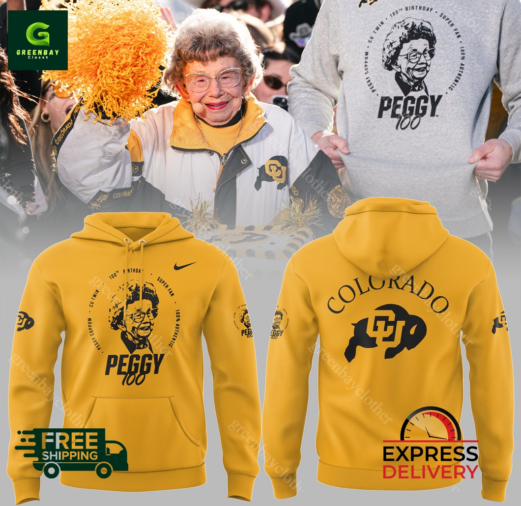 Colorado Buffaloes NCAA Limited Happy Birthday 100th Miss Peggy Yellow Hoodie description