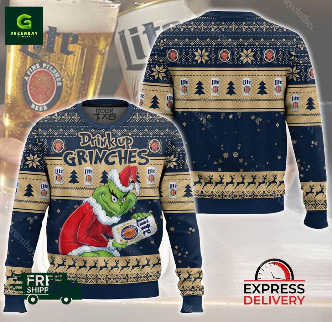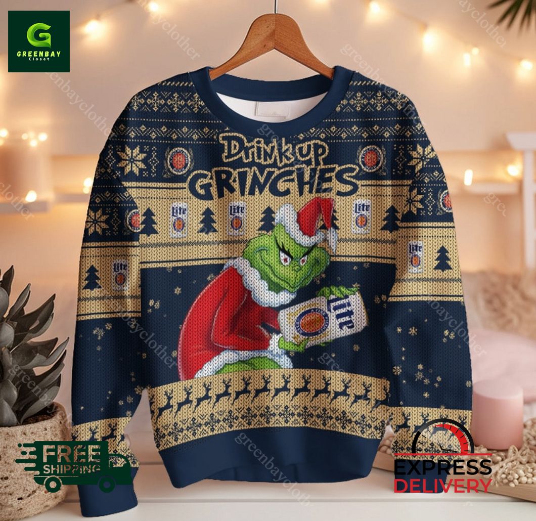 Drink Up Grinches Miller Lite Ugly Christmas Sweater description
