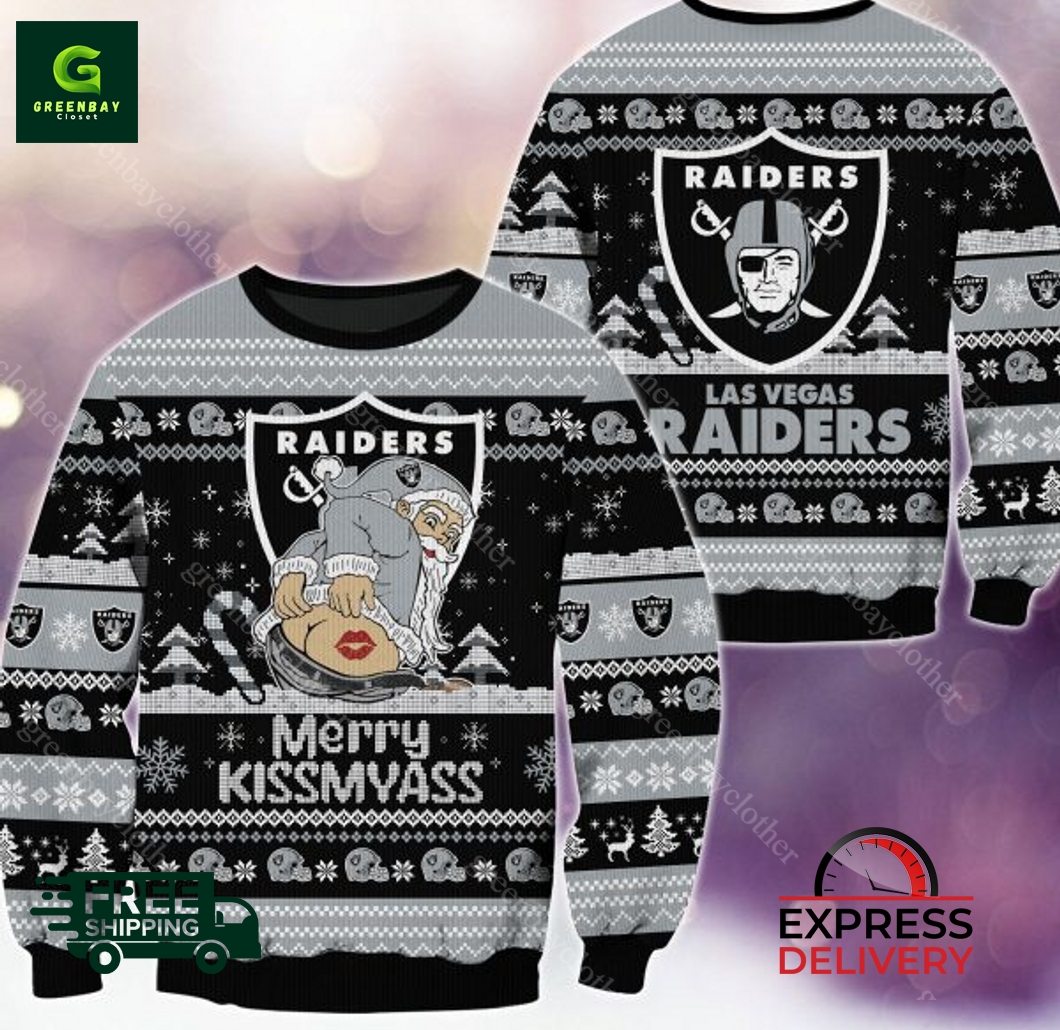 Introducing the must-have Las Vegas Raiders NFL Merry Kissmyass Knit Pattern Ugly Sweater! This festive piece of apparel is perfect for showing your support for your favorite football team while spreading holiday cheer. Its intricate and eye-catching knit pattern is sure to turn heads wherever you go. Made from soft and comfortable materials, this sweater will keep you warm and cozy all season long. Imagine the joy of donning this unique sweater to every outing. You’ll be the life of the party at friends’ gatherings and the envy of your coworkers at the office. Its versatility makes it a perfect choice for daily life, as it pairs well with jeans, leggings, or even a dressy skirt. Wherever you go, this sweater will bring smiles to the faces of those around you. So, don’t miss out on this opportunity to own a piece of Las Vegas Raiders history and spread holiday cheer in style!