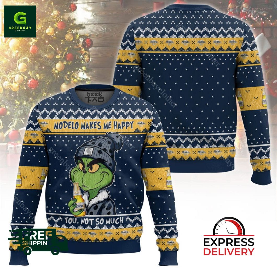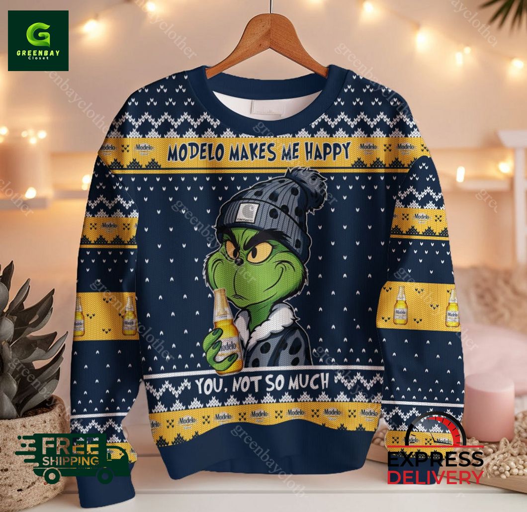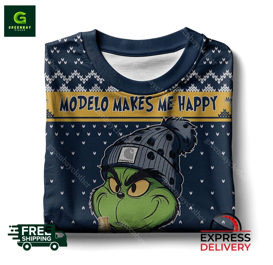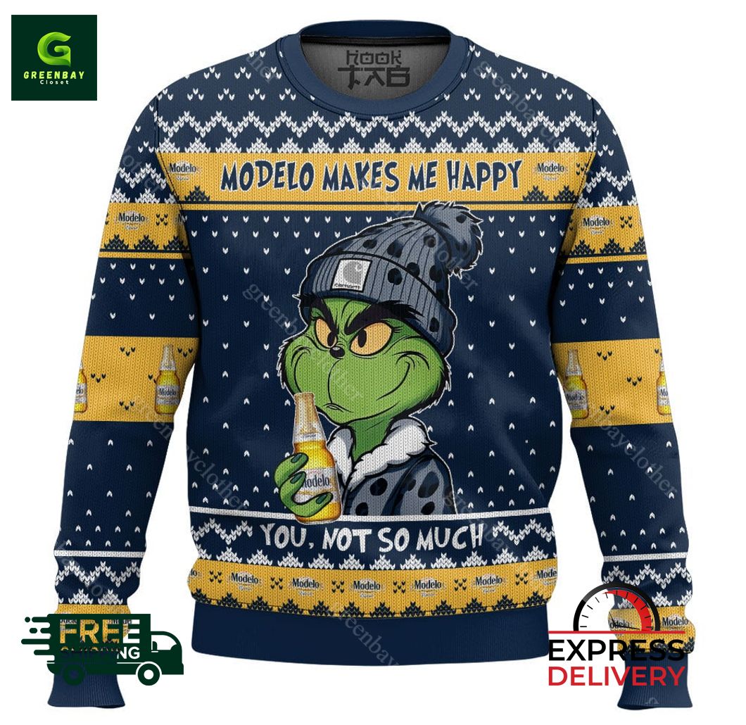 Introducing the Modelo Makes Me Happy Ugly Christmas Sweater, the ultimate holiday essential for any beer lover! Our eye-catching sweater features an exclusive, all-over print design of the iconic Modelo logo, along with festive Christmas elements that will spread cheer wherever you go. Crafted from premium materials, this sweater boasts superior comfort and warmth, making it perfect for cozying up by the fire or attending your favorite holiday parties. Whether you’re a casual fan or a devout aficionado, the Modelo Makes Me Happy Ugly Christmas Sweater is sure to bring a smile to your face and make you the life of the party. Get yours today and embrace the festive spirit in style!