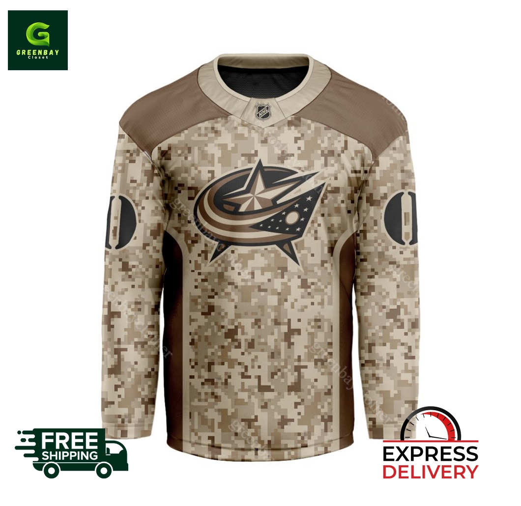 Gear up for game day with the official Columbus Blue Jackets Desert Camouflage Personalized Hockey Jersey! Made in the USA from premium materials, this jersey features a unique desert camouflage print that will make you stand out from the crowd. Its personalized name and number let you show your fandom in style. The jersey is designed for breathability and comfort, ensuring you stay cool and focused throughout the game. Support your favorite team while expressing your individuality with this limited-edition jersey. Order now and experience the thrill of the ice in style! Worldwide shipping is available, so no matter where you are, you can proudly display your Blue Jackets pride.