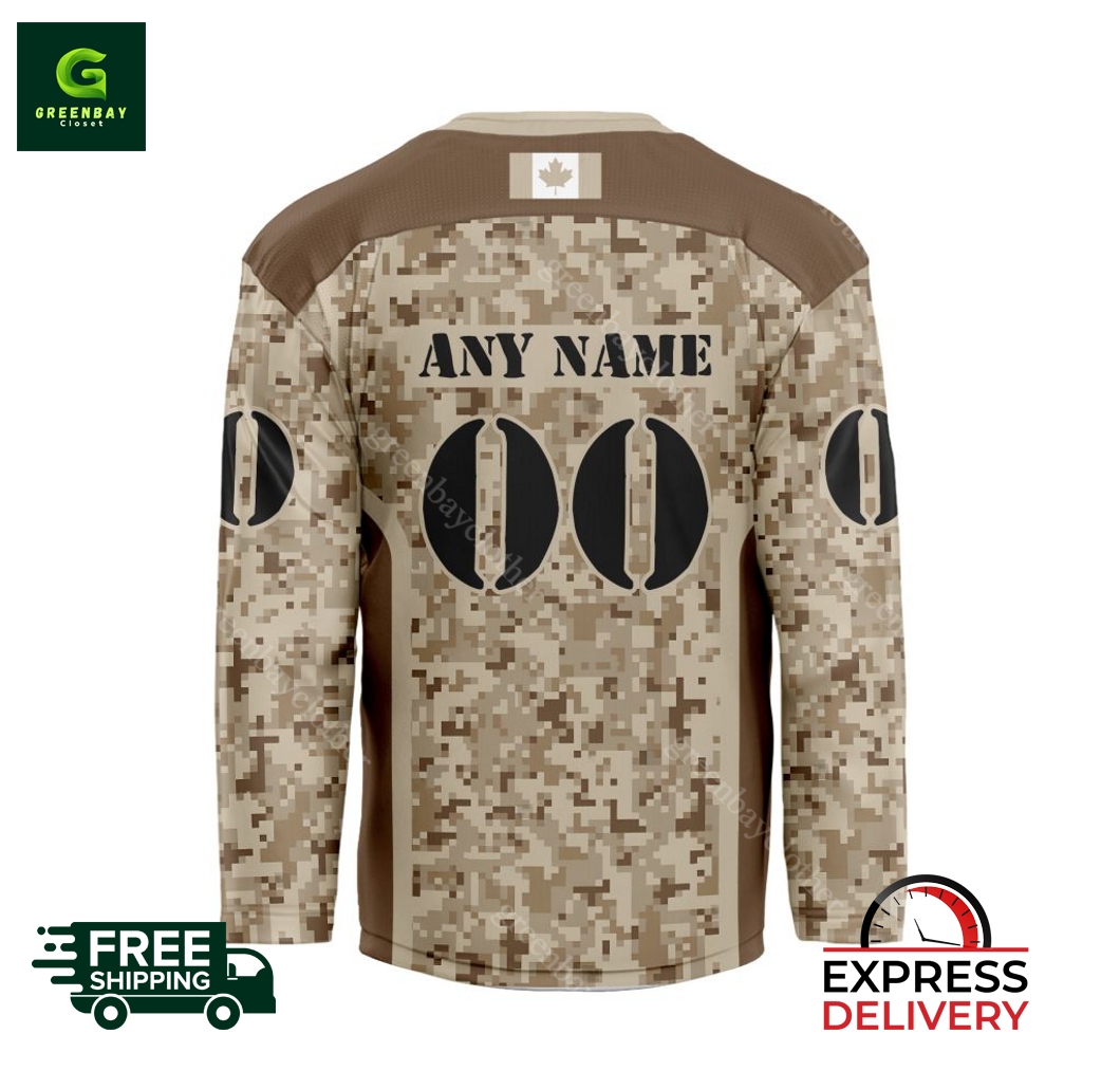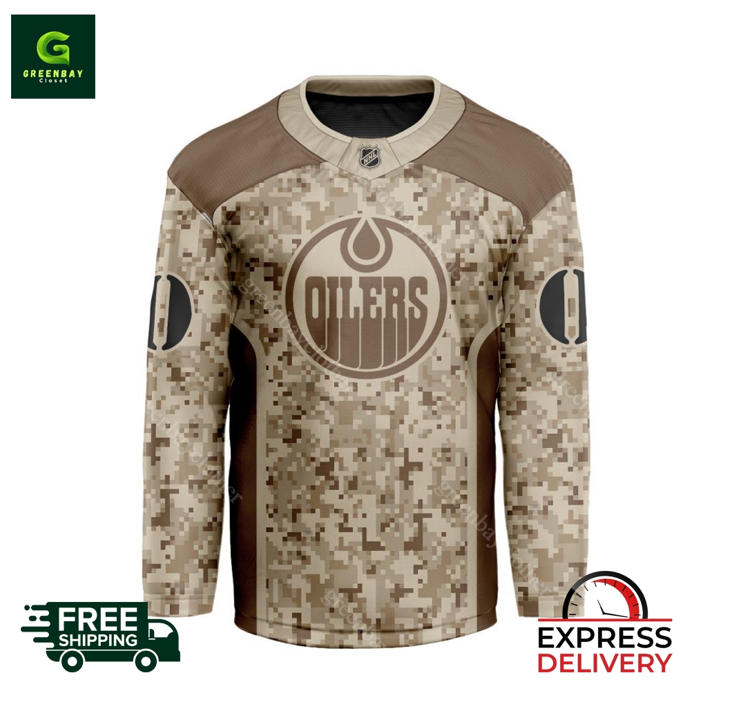 Introducing the ultimate statement piece for loyal Edmonton Oilers fans – our officially licensed NHL Desert Camouflage Personalized Hockey Jersey! Designed in the iconic desert camouflage pattern, this jersey exudes both style and authenticity. At a competitive price point, it offers incredible value without compromising quality. Constructed from durable, breathable fabric, our jersey ensures comfort all game long, whether you’re cheering from the stands or playing on the ice. Personalize your jersey with your favorite player’s name and number, showcasing your unwavering Oilers pride. Based in the United States, we pride ourselves on our exceptional craftsmanship and unmatched customer service. Order now and experience the thrill of wearing your personalized jersey while supporting the Oilers in their pursuit of the Stanley Cup! With worldwide shipping available, we ensure that your passion for hockey transcends borders.